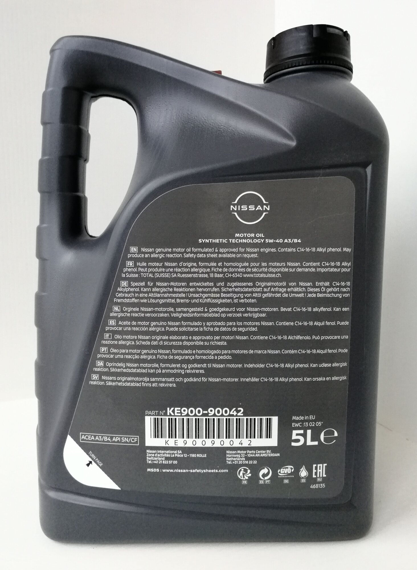 Масло моторное Nissan Motor Oil 5w40 синтетическое, API SN/CF, ACEA A3/B4, универсальное, 5л, арт. KE900-90042