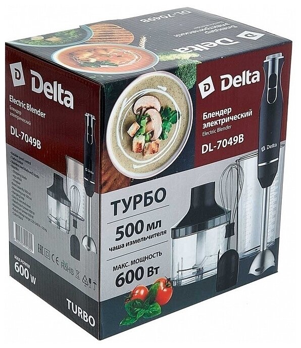 Блендер погружной Delta DL-7049B черный: 600 Вт, регулир. скорости, стакан, венчик,измельчитель