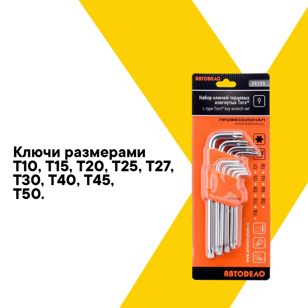 Набор ключей АвтоДело TORX (Т10,Т15,Т20,Т25,Т27,Т30,Т40,Т45,Т50) 9 предметов