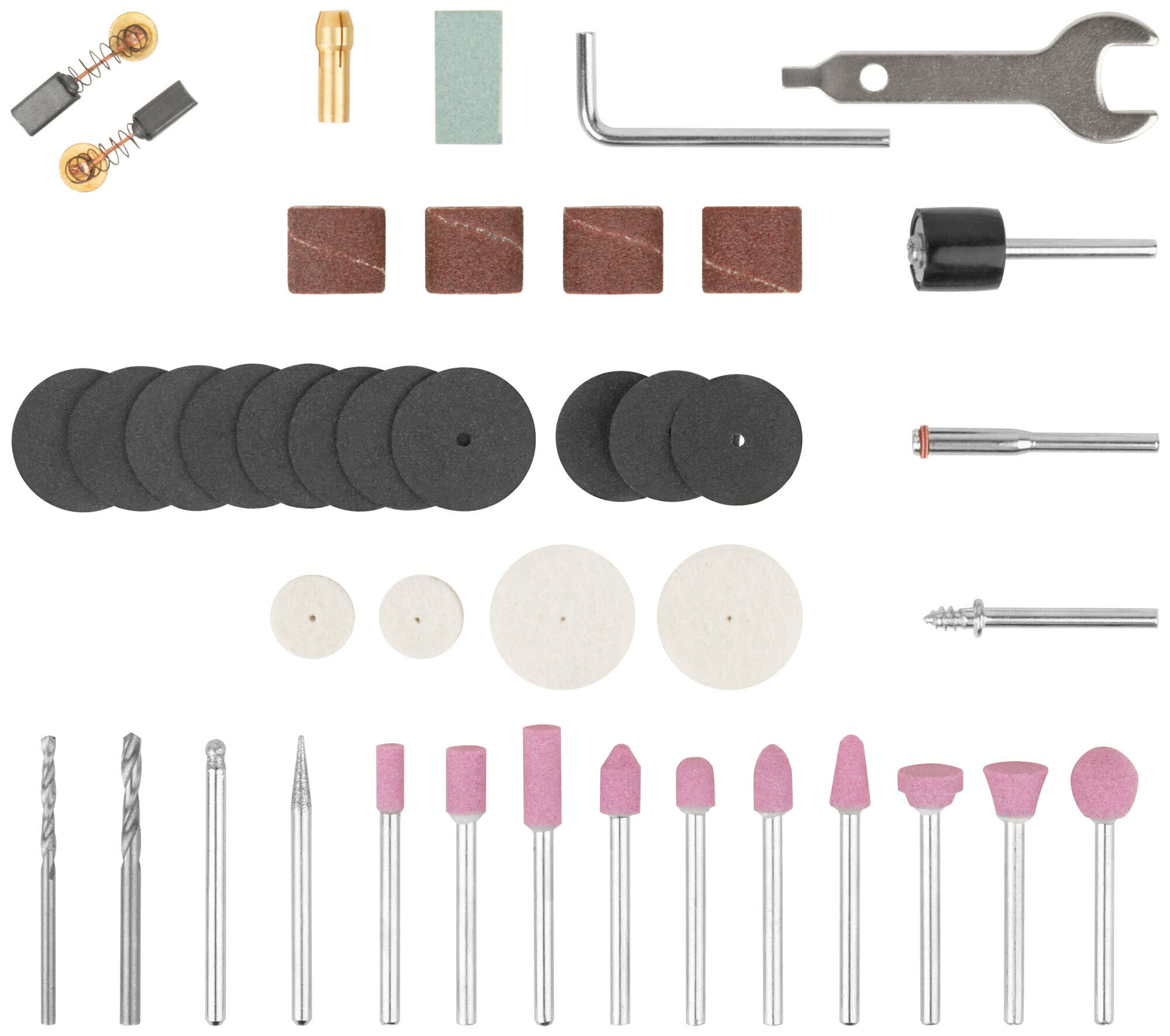 Гравировальная машина 130 Вт; 10000-35000 об/мин; 2,4/3,2 мм; БС щеток; набор насадок 210 шт.; кейс Fit