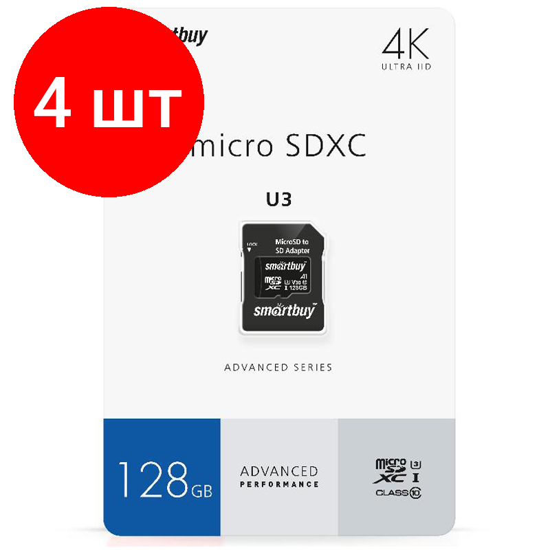 Купить Комплект 4 шт, Карта памяти SmartBuy MicroSDXC 128GB PRO U3 Advanced, Class 10, скорость чтения 90Мб/сек (с адаптером SD)