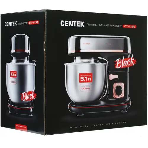 Планетарный миксер Centek CT-1139 Black- черный/хром 1300Вт, чаша 5.1л, 3 насадки, 6 скоростей