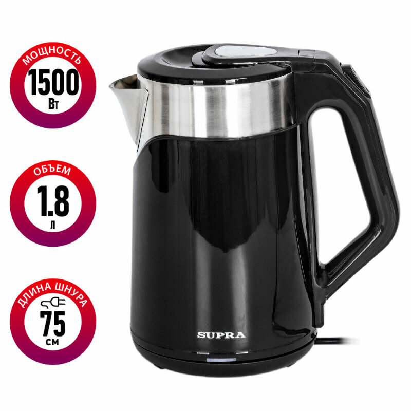 Чайник электрический Supra KES-1898, 1.8 л, черный/нержавеющая сталь