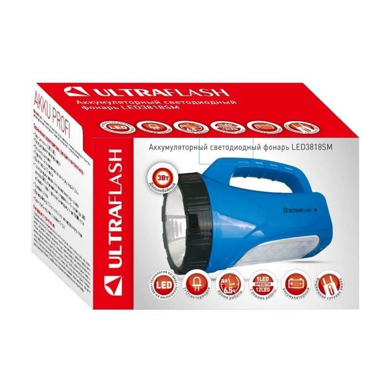 Ultraflash LED3818SM (фонарь аккум. 220В, синий, 3W LED+12SMD LED, 2 реж., SLA, пласт, коробка)