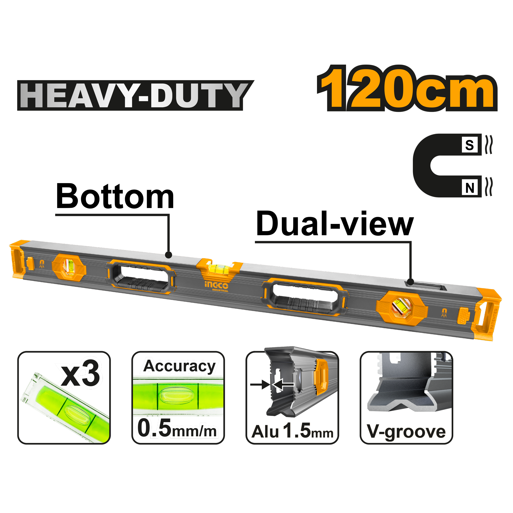 Строительный усиленный уровень с магнитом INGCO HSL68120 INDUSTRIAL 120 см