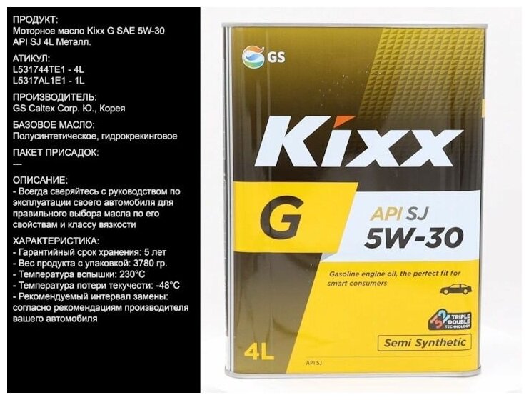 СохранитьПолусинтетическое моторное масло Kixx G SJ 5W-30, 4 л, 1 шт интересное: