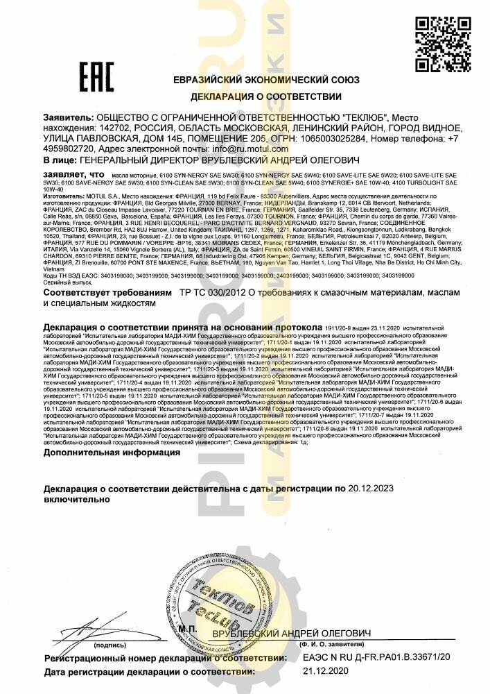 MOTUL 107952 MOTUL 6100 SAVE-NERGY 5W30 Масло моторное синт. 1л