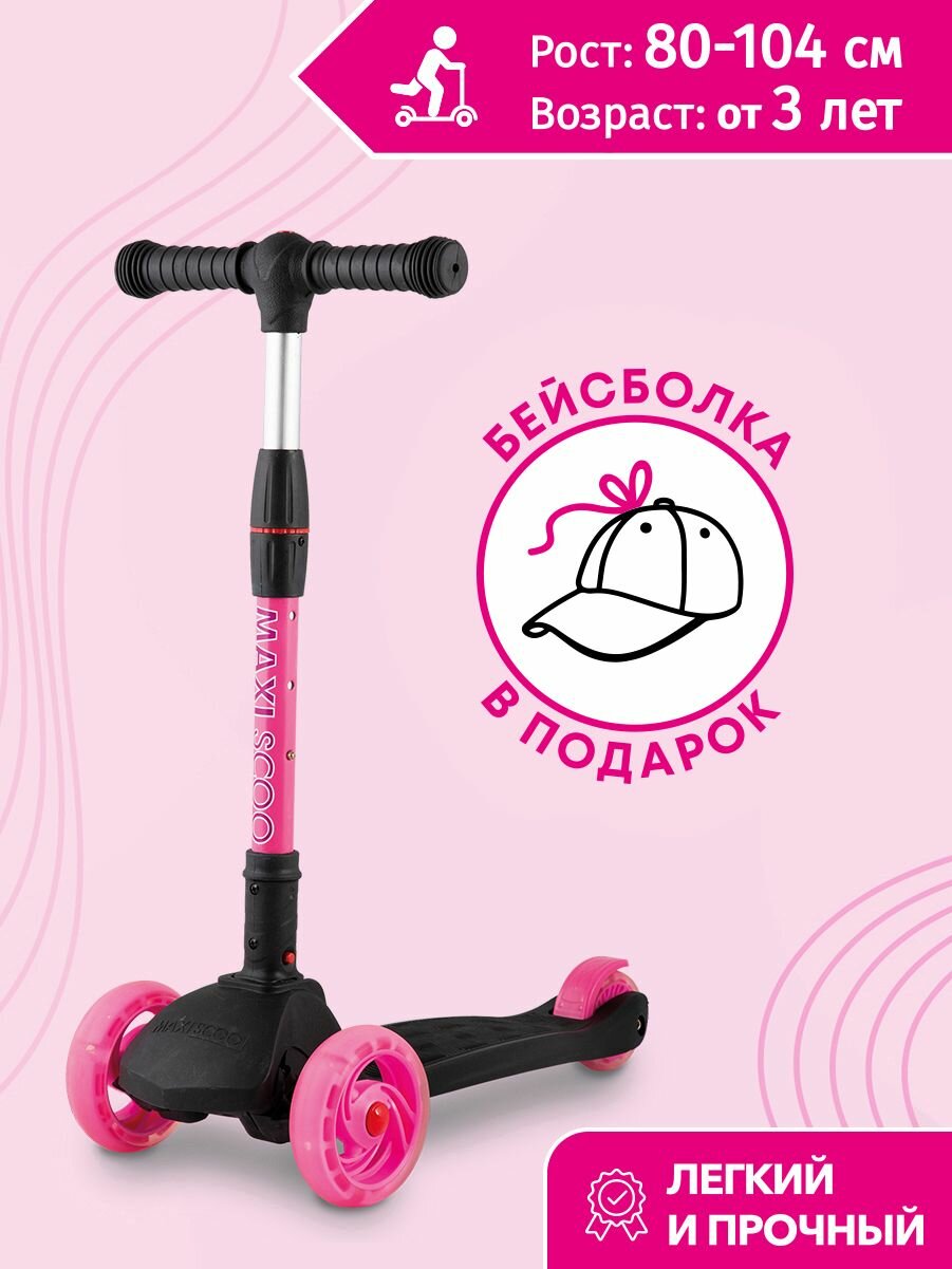 Самокат Maxiscoo 3-х колесный Складной "Baby Delux", со Светящимися Колесами, Черный с Розовым