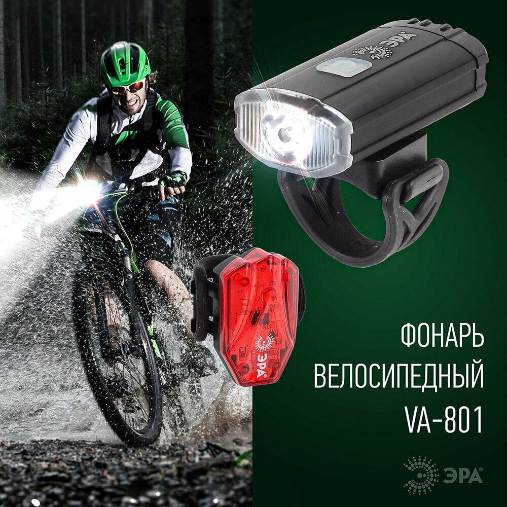Фонарь ЭРА велосипедный VA-801, светодиодный, 2 аккум Li-ion 800mAч -головной и 100 mAч задний