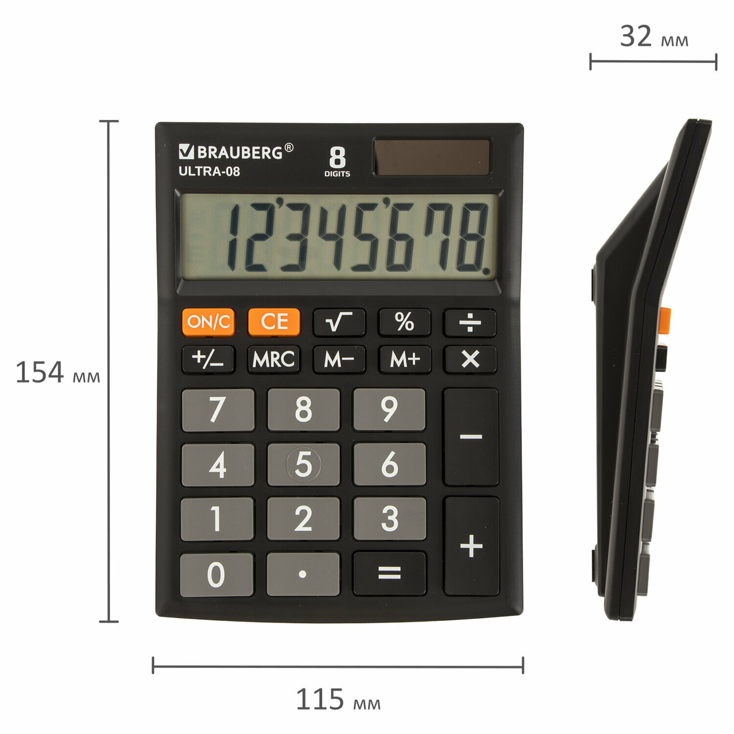 Калькулятор настольный BRAUBERG ULTRA-08-BK, компактный (154x115 мм), 8 разрядов, двойное питание, черный, 250507, 250507
