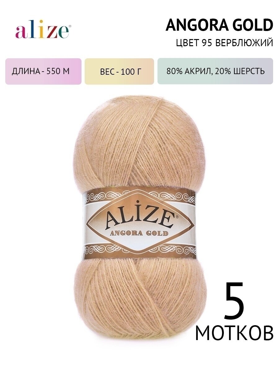 Пряжа для вязания крючком, спицами Alize Ализе Angora Gold, тонкая, акрил/шерсть, цвет 652, ангора, 5 шт. по 100 г, 550 м