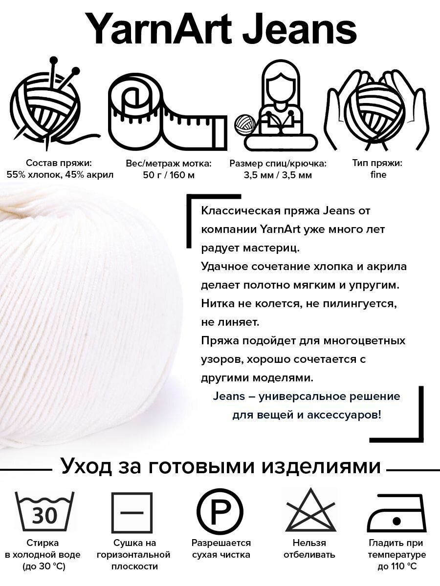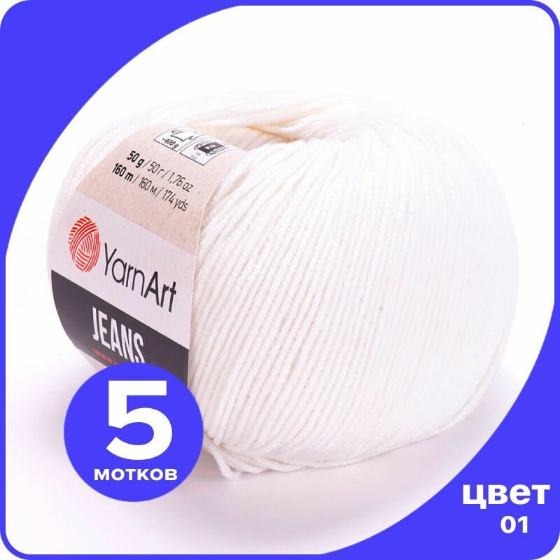 Купить Пряжа YarnArt Jeans белый (0001), 55%хлопок/45%акрил, 160м, 50г, 5шт