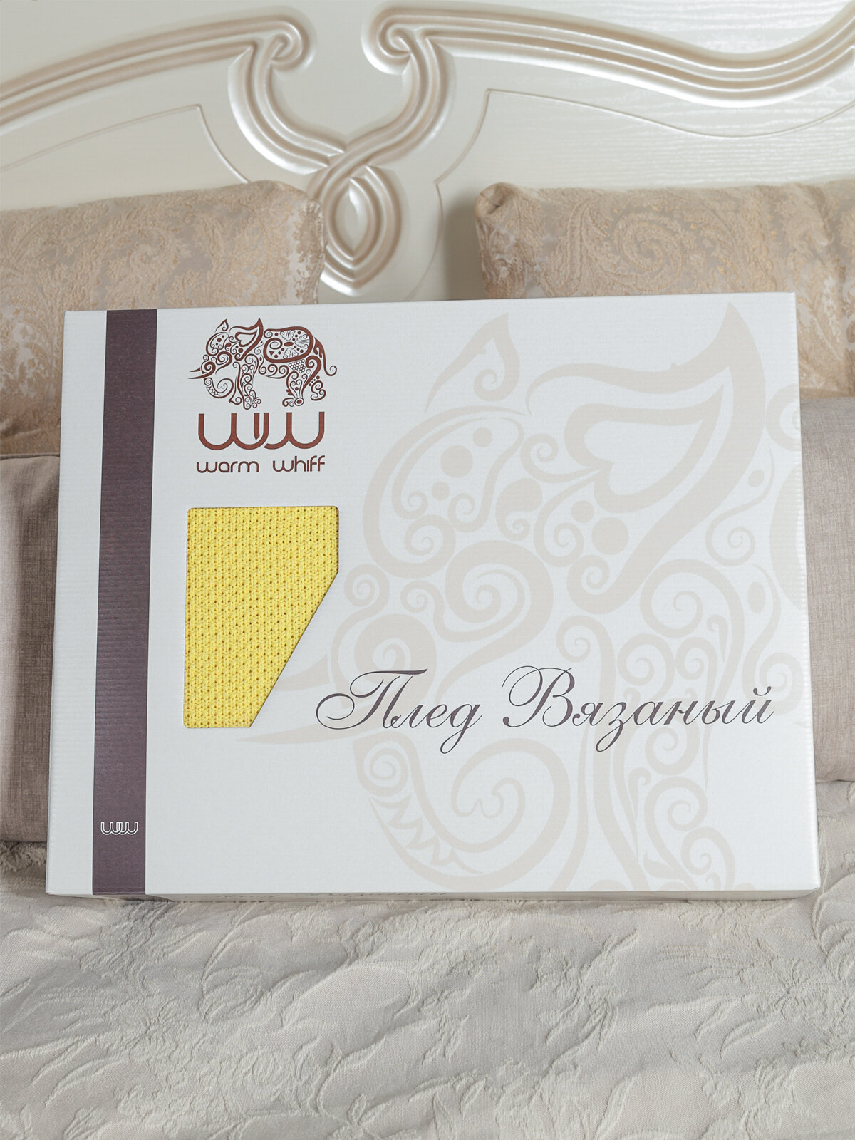 Плед, вязаный, новогодний, Warm Whiff, желтый, 180х220, хлопок 100%, покрывало на кровать, на диван, на кресло, большой, тонкий, красивый, нежный, в подарочной коробке