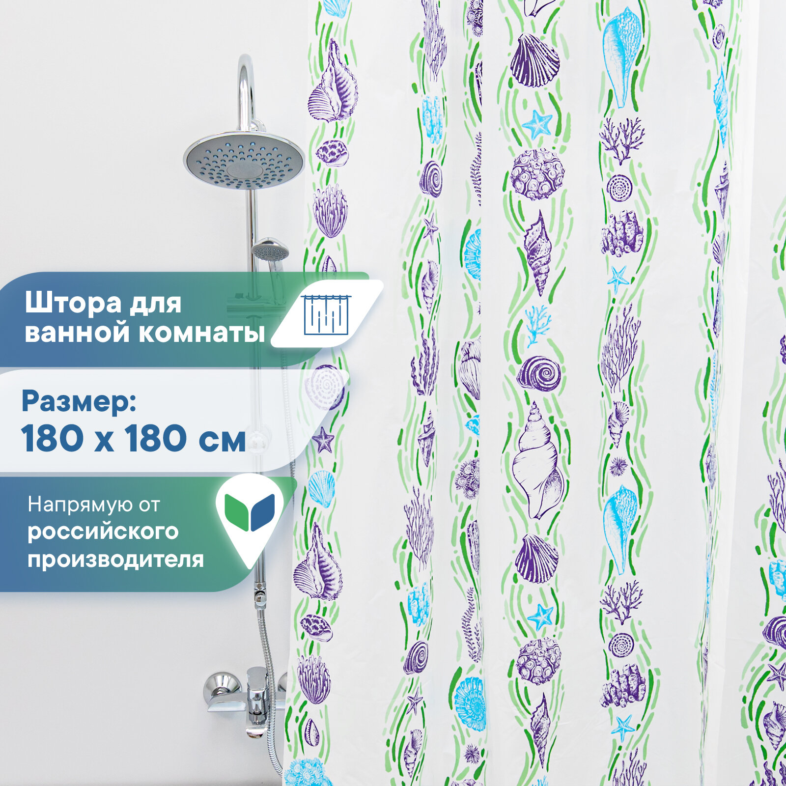 Штора для ванной комнаты VILINA водонепроницаемая с рисунком занавес с кольцами 180х180 см Ракушки зелёная