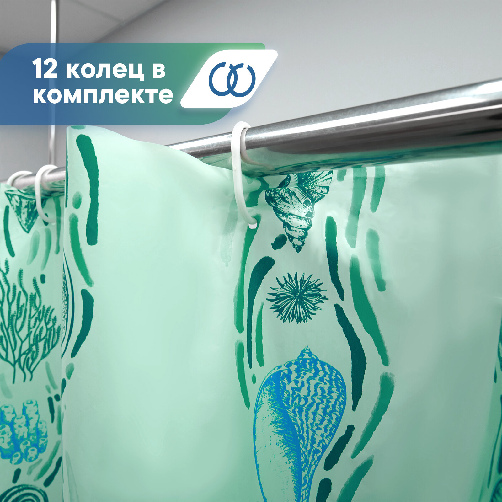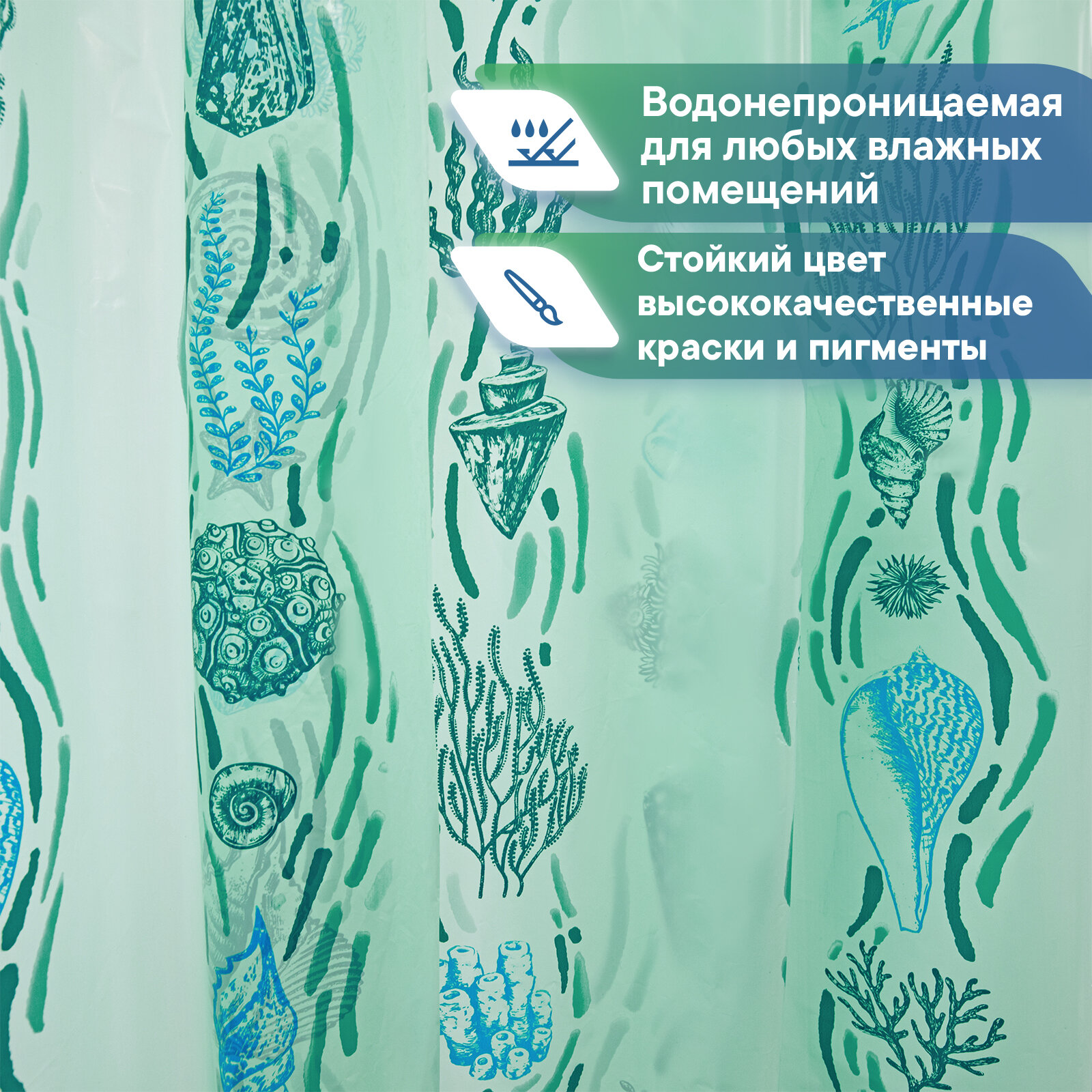 Купить Штора для ванной комнаты VILINA водонепроницаемая с рисунком занавес с кольцами 180х180 см Ракушки зелёная