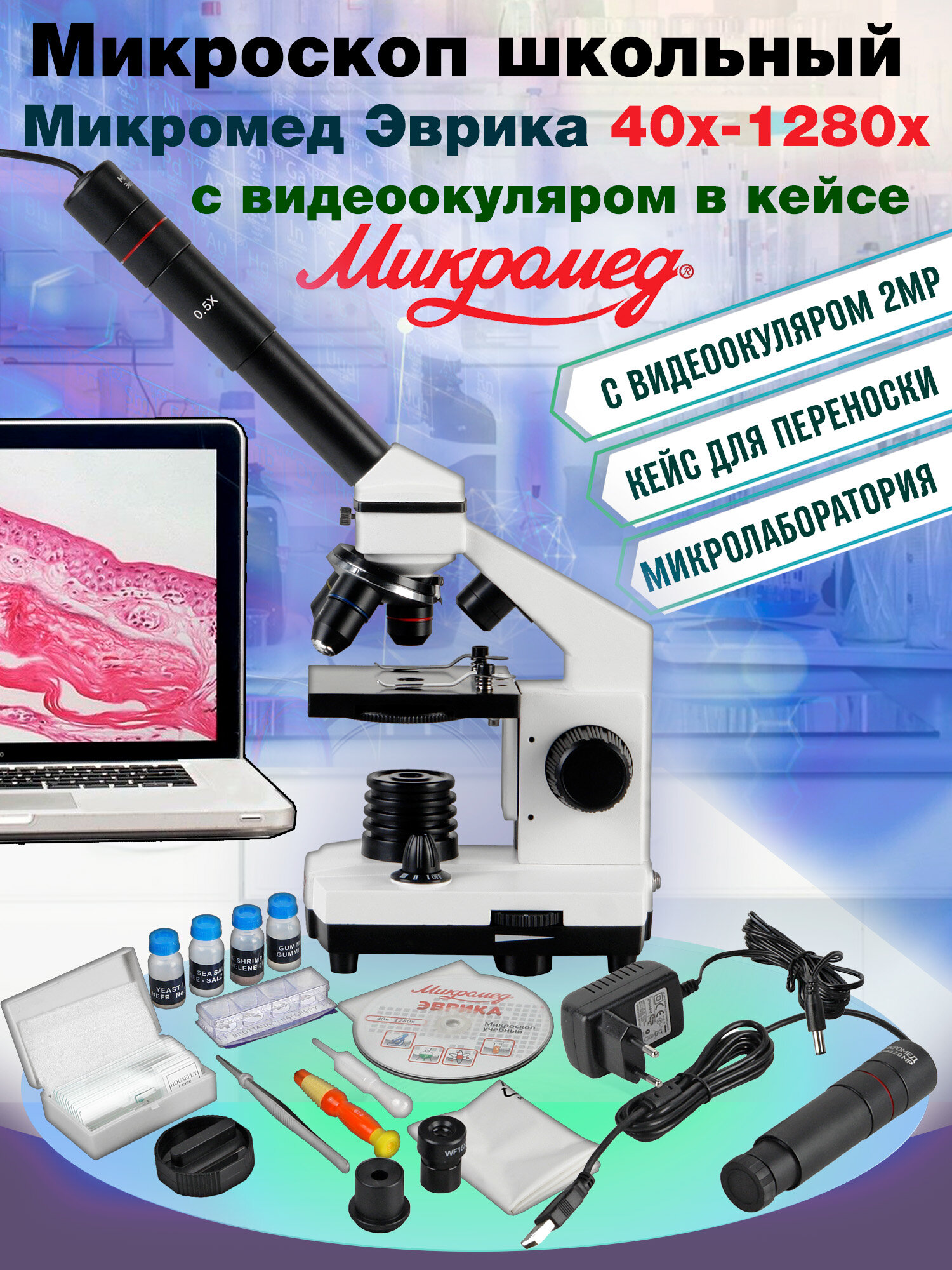 Микроскоп Микромед Эврика 40х-1280х с видеоокуляром, в кейсе