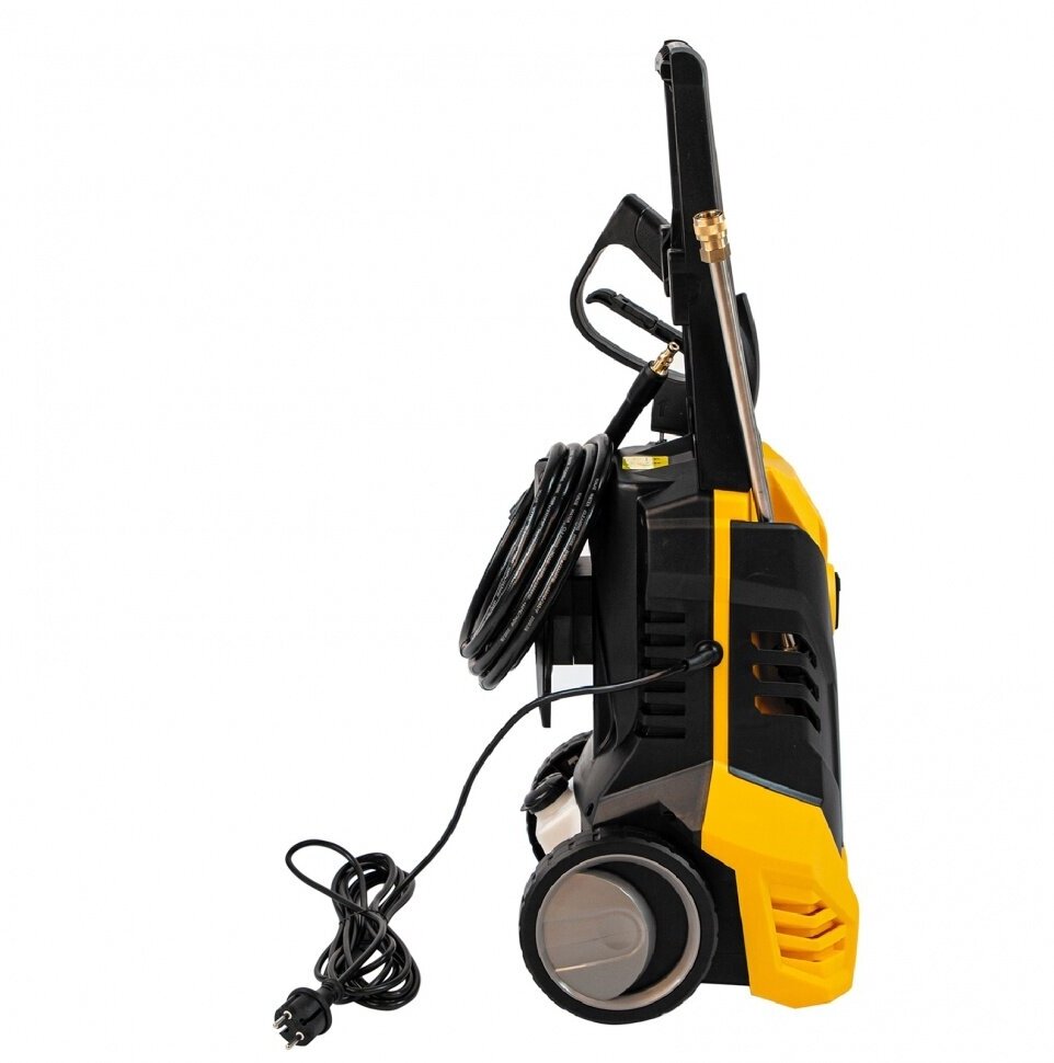Хорошее давление. Удобная рукоятка пистолета и вращающийся в ней штуцер шланга высокого давления. Съемная штанга из металла. Легкость изменения горизонта струи поворотом сопла. Фильтр во входном съемном штуцере. Есть отсек для хранения штанги и место для намотки провода |