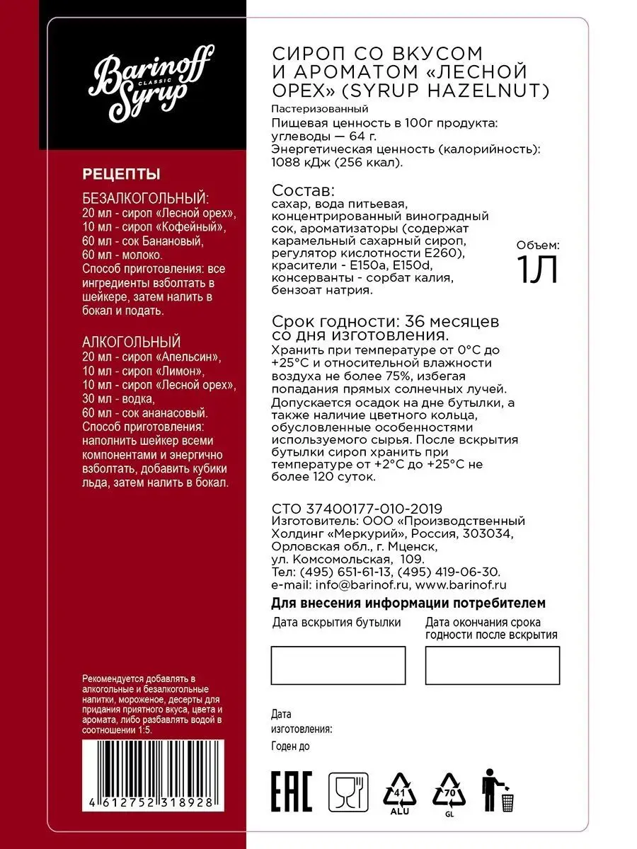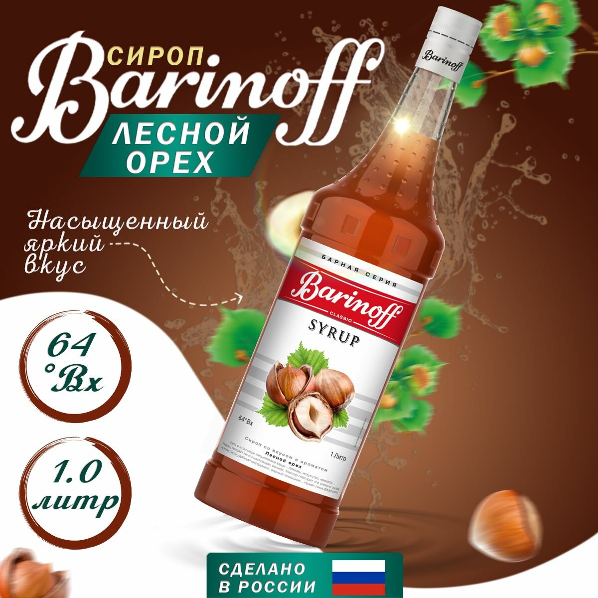 Сироп BARINOFF "Лесной орех", 1 л, стеклянная бутылка В комплекте: 1шт.