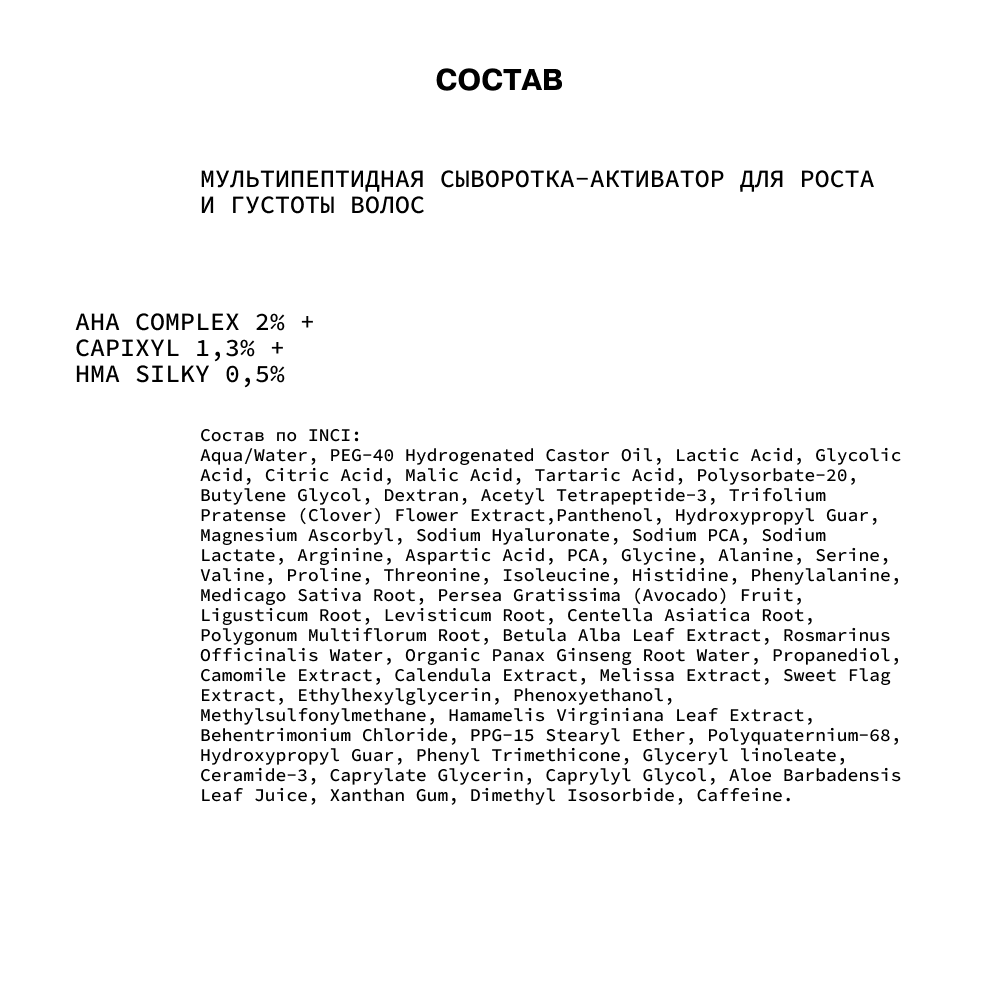 | Состав | aqua/water, PEG-40 hydrogenated castor oil, lactic acid, glycolic acid, citric acid, malic acid, tartaric acid, polysorbate-20, butylene glycol, dextran, acetyl tetrapeptide-3, trifolium pratense (clover) flower extract, panthenol, hydroxypropyl guar, magnesium ascorbyl, sodium hyaluronate, sodium PCA, sodium lactate, arginine, aspartic acid, PCA, glycine, alanine, serine, valine, proline, threonine, isoleucine, histidine, phenylalanine, medicago sativa root, persea gratissima (avocado) fruit, ligusticum root, levisticum root, centella asiatica root, polygonum multiflorum root, betula alba leaf extract, rosmarinus officinalis water, organic panax ginseng root water, propanediol, camomile extract, calendula extract, melissa extract, sweet flag extract, ethylhexylglycerin, phenoxyethanol, methylsulfonylmethane, hamamelis virginiana leaf extract, behentrimonium chloride, PPG-15 stearyl ether, polyquaternium-68, hydroxypropyl guar, phenyl trimethicone, glyceryl linoleate, ceramide-3, caprylate glycerin, caprylyl glycol, aloe barbadensis leaf juice, xanthan gum, dimethyl isosorbide, caffeine |