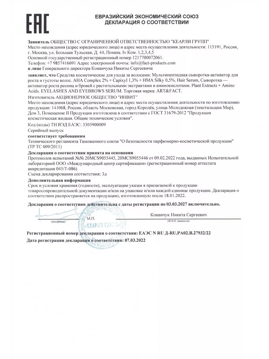 ART&FACT. / Мультипептидная сыворотка-активатор для роста, блеска и густоты волос