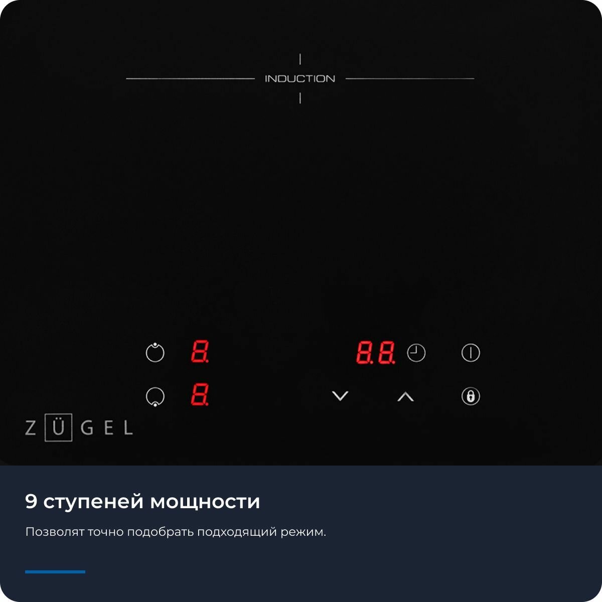 Индукционная варочная панель ZUGEL ZIH293B, сенсорное управление, 9 уровней мощности, 3500 Вт, сенсор наличия посуды, таймер, черный