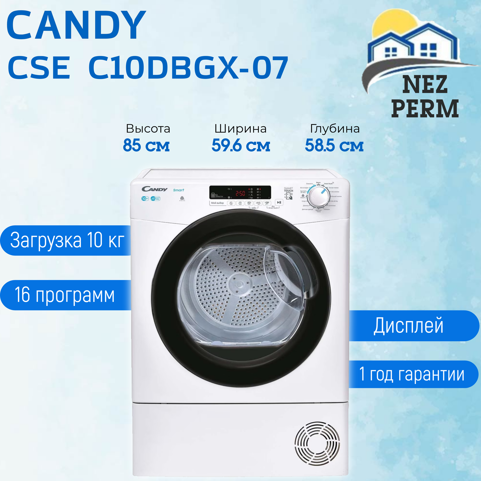 Полноразмерная сушильная машина Candy Smart CSE C10DBGX-07, конденсационная, на 10 кг