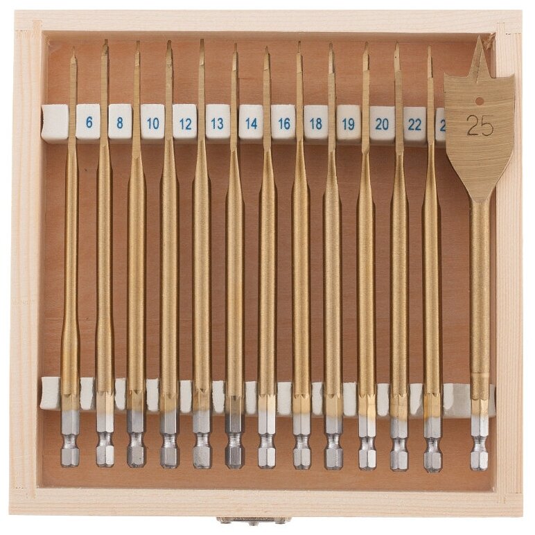 Набор сверл перовых по дереву, 6-8-10-12-13-14-16-18-19-20-22-24-25мм, 13шт, деревянный кейс Matrix (70442)