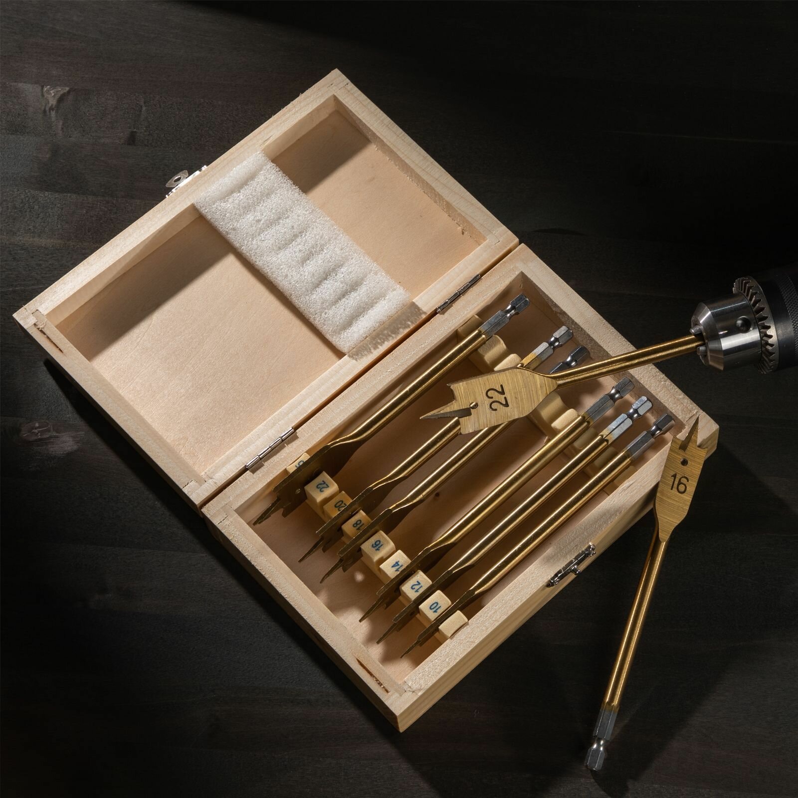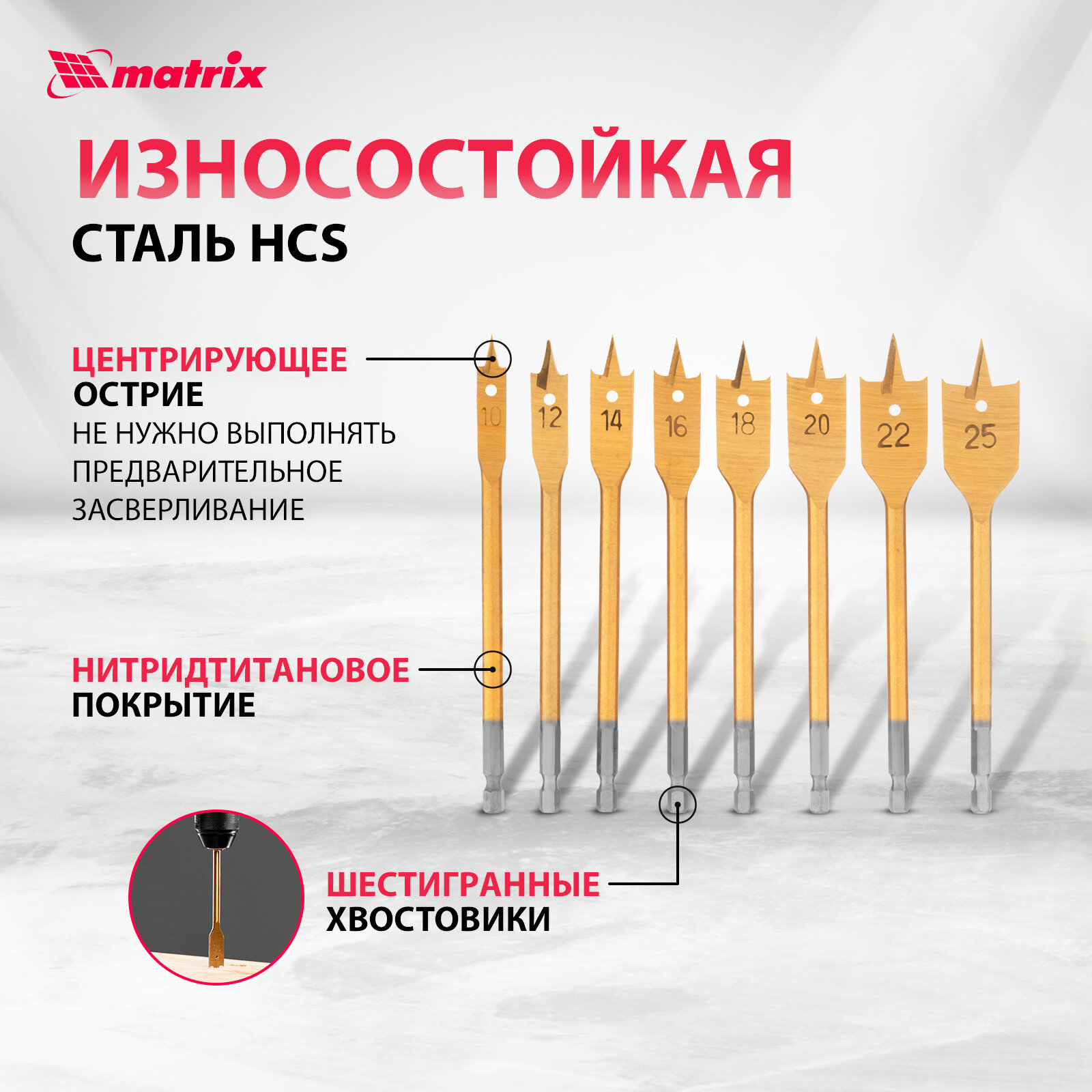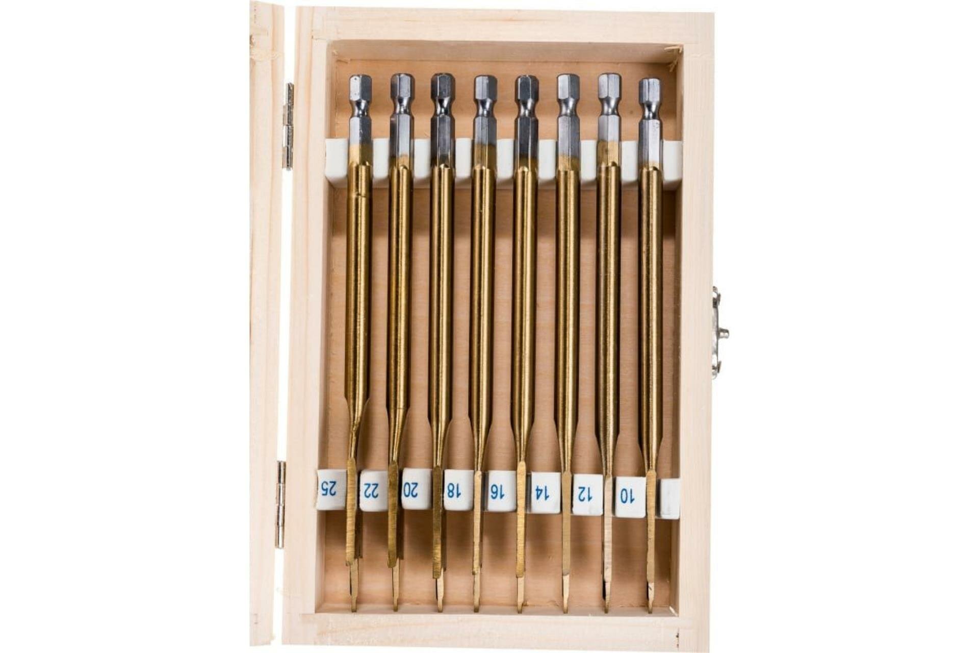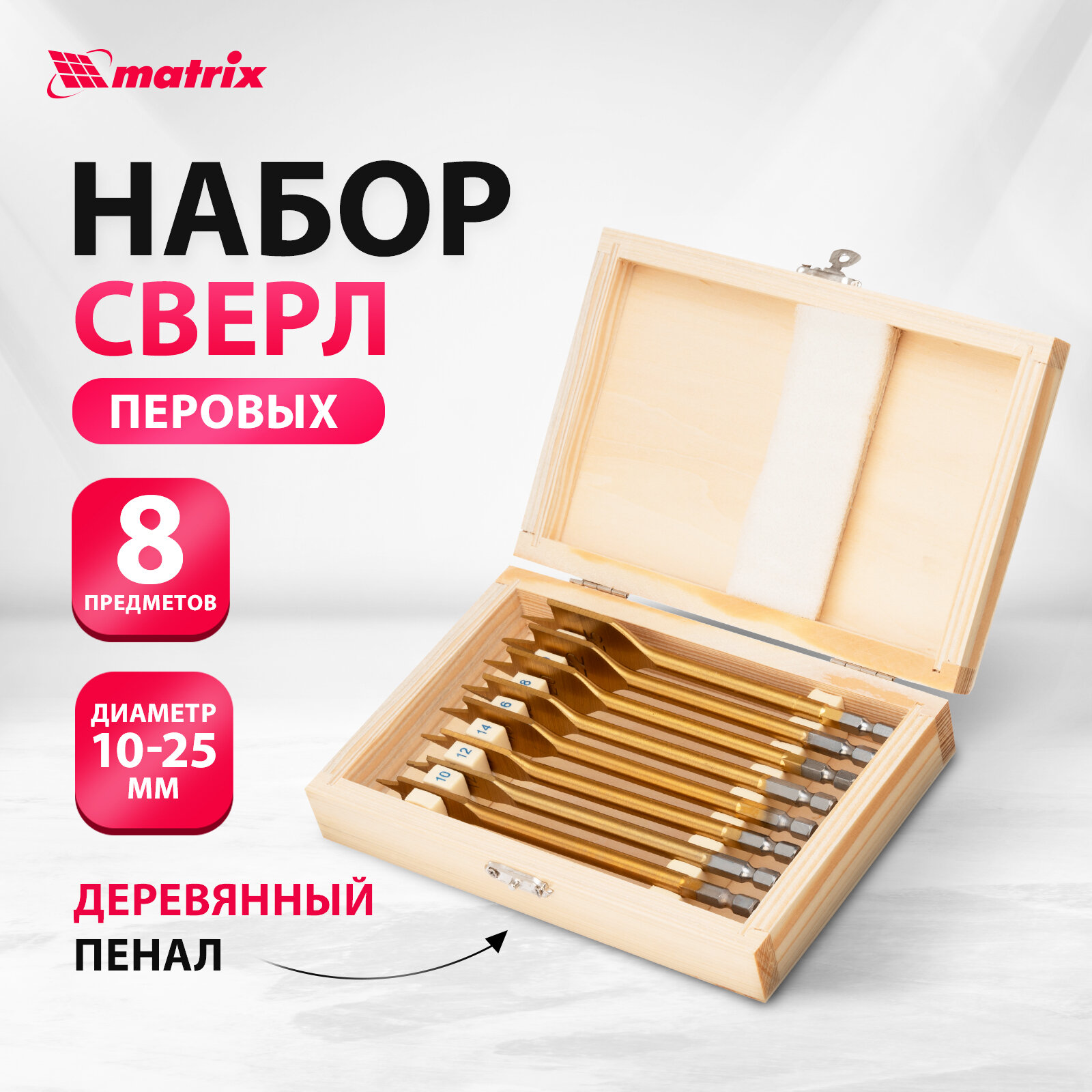 Набор сверл перовых по дереву, 10-12-14-16-18-20-22-25 мм, 8 шт, деревянный кейс Matrix