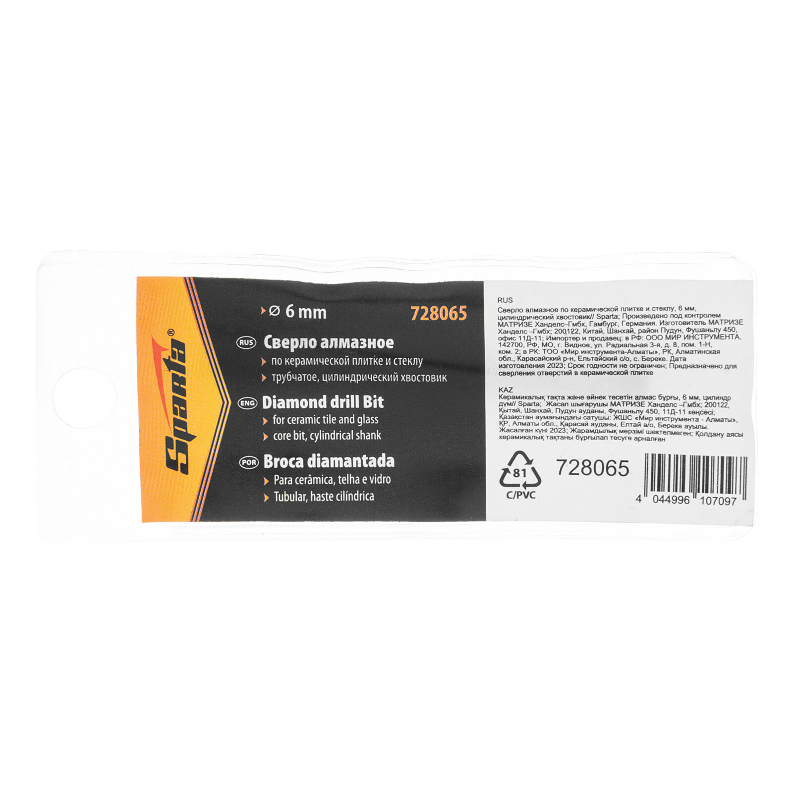 SPARTA Сверло алмазное по керамической плитке и стеклу,6 мм, цилиндрический хвостовик//728065