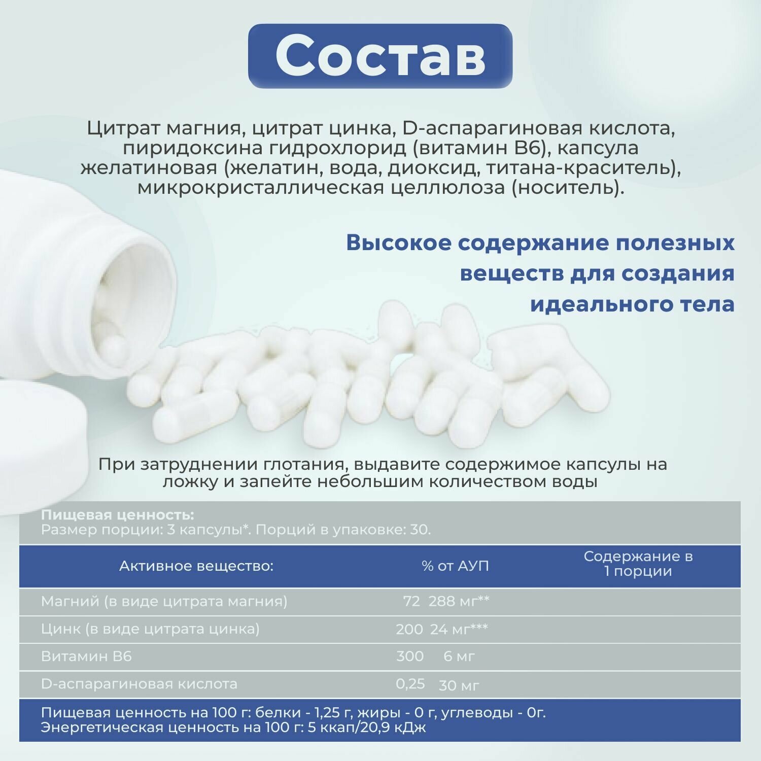 | Состав | цитрат магния, цитрат цинка, D-аспарагиновая кислота, пиридоксина гидрохлорид (витамин В6), капсула желатиновая (желатин, вода, диоксид титана-краситель), микрокристаллическая целлюлоза (носитель) |