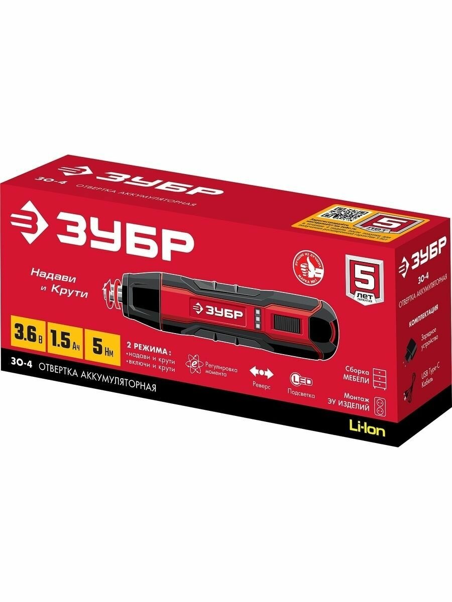 Аккумуляторная отвёртка 5 Нм Зубр ЗО-4
