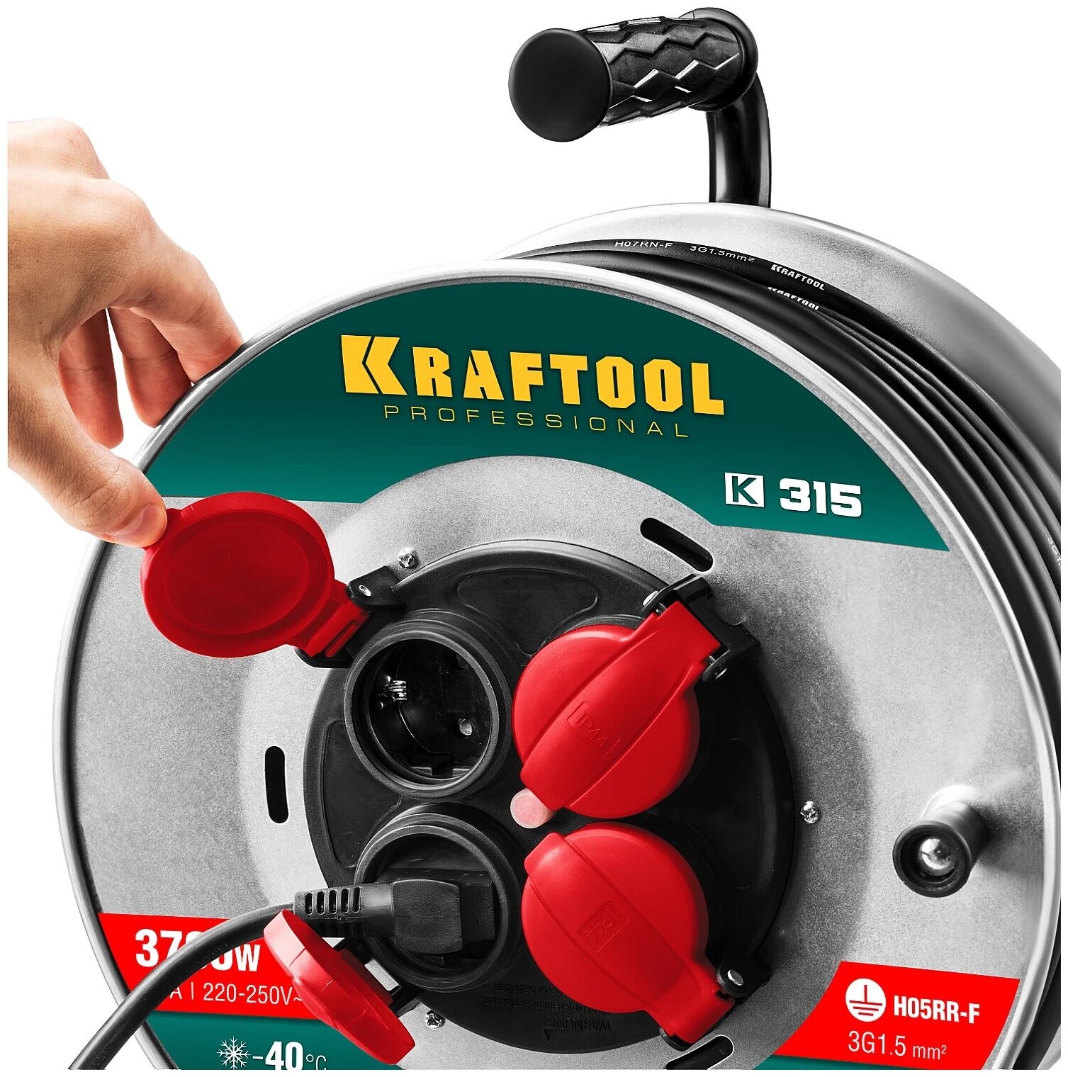 Силовой удлинитель на стальной катушке KRAFTOOL КГ 3х1.5 50м 3700Вт IP44, K-315