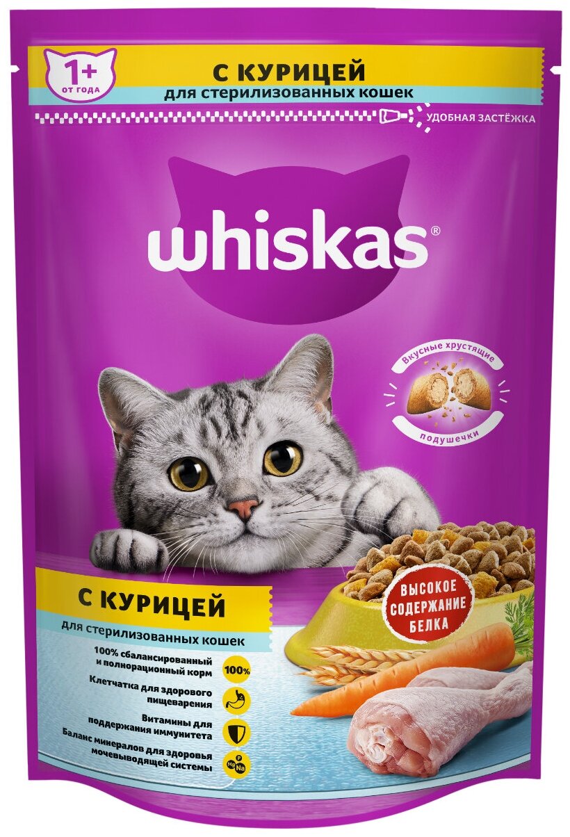 Whiskas корм для взрослых стерилизованных кошек всех пород, подушечки с курицей 350 гр