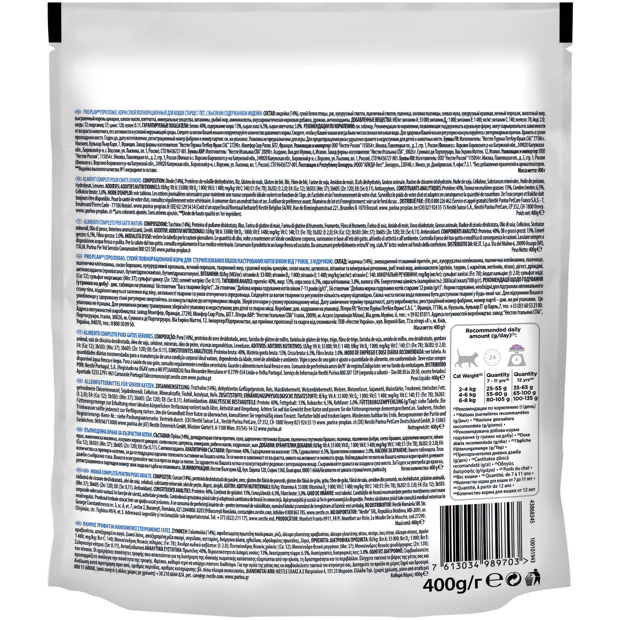 Сухой корм Pro Plan для стерилизованных кошек и кастрированных котов старше 7 лет, с индейкой, Пакет, 400г