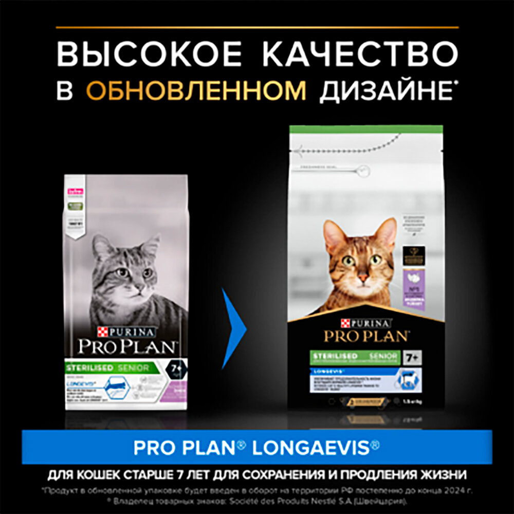 Сухой корм для стерилизованных пожилых кошек Pro Plan Sterilised Longevis 7+ , с индейкой 1,5 кг