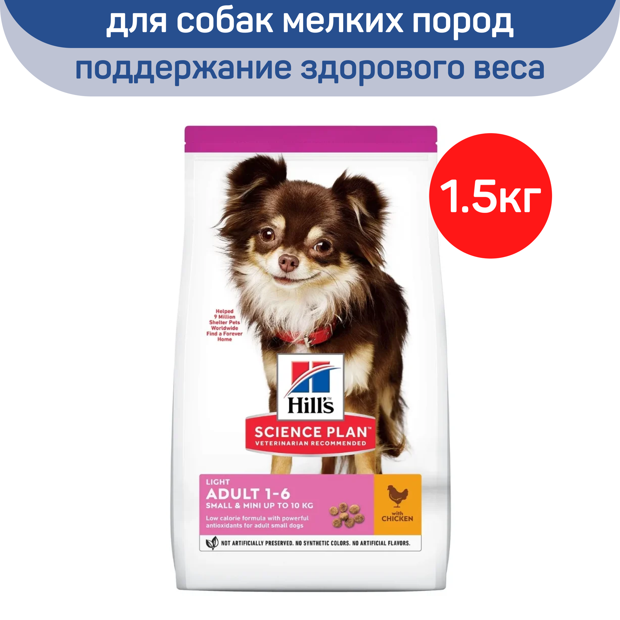 "Корм сухой Hill's Science Plan Light, для поддержания здорового веса, с курицей и рисом, для собак мелких пород, 1,5 кг"