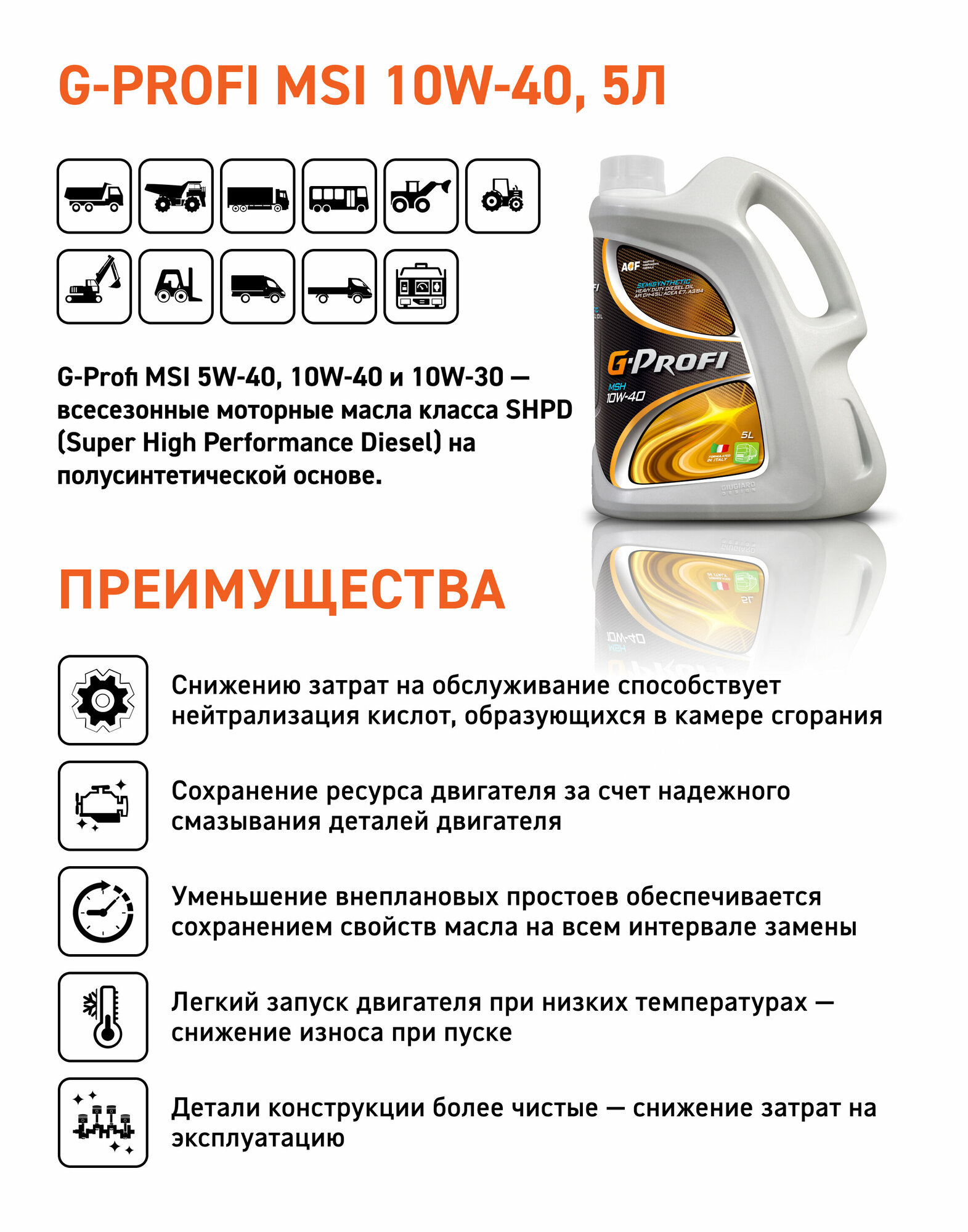 Масло моторное п/синтетическое G-Profi MSI 10W40, API CI-4/SL, ACEA E7, A3/B4, 10л