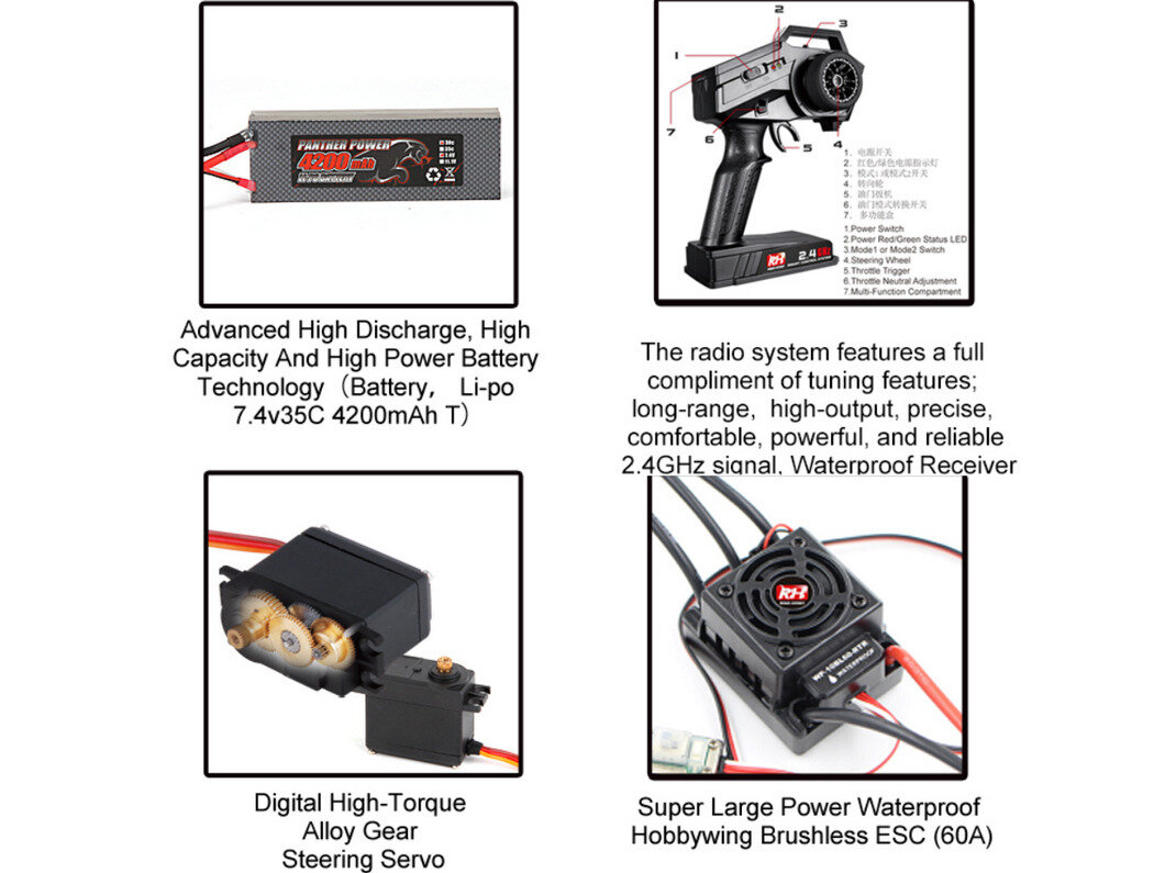 | Комплектация | собранная модель автомобиля, пульт ДУ 2.4 GHz, аккумулятор Li-Po 7.4V 4200 mAh 35C, зарядное устройство для аккумулятора, инструкция |