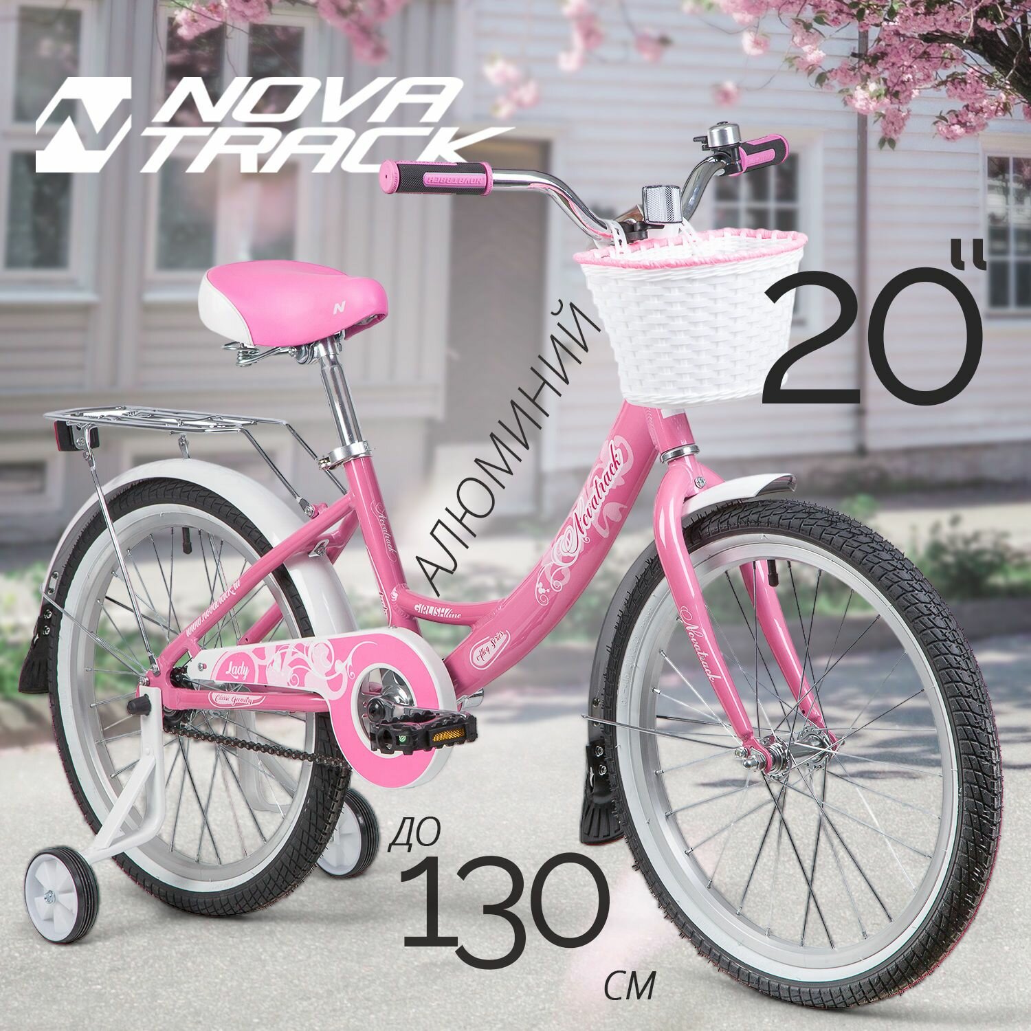 Велосипед детский для девочки 20" NOVATRACK GIRLISH line розовый, алюминиевая рама, от 7 до 10 лет на рост 125-130 см, двухколесный городской велик со съемными колесами и корзиной