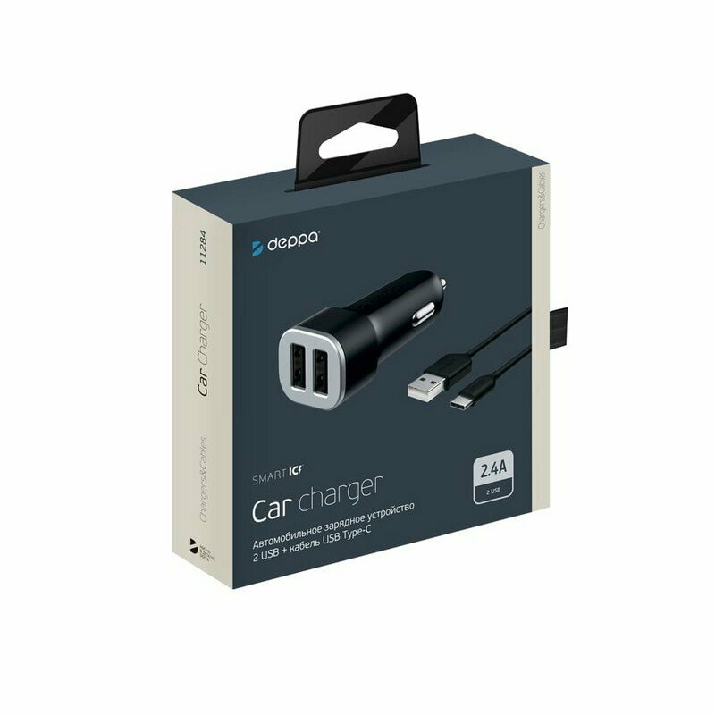 Автомобильное зарядное устройство АЗУ 2USB + кабель Type-C Deppa (11284) 2 USB 2.4А черный