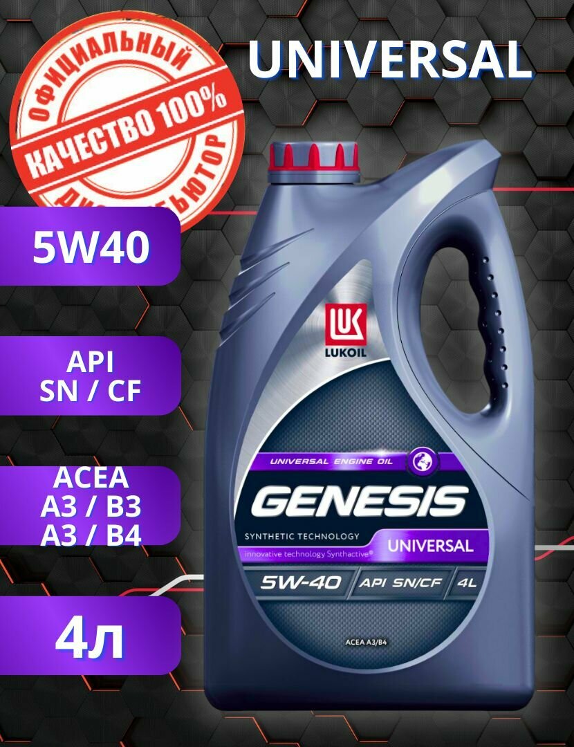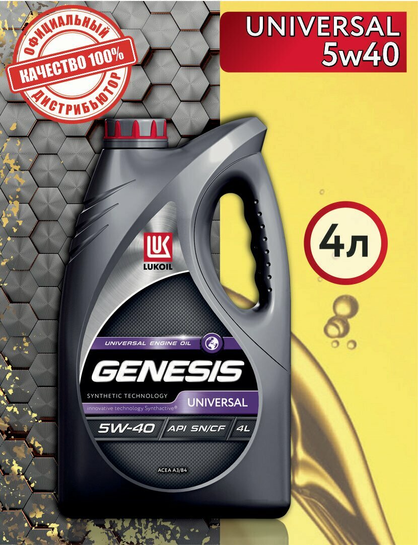Масло моторное Лукойл Genesis Universal 5w40 синтетическое, API SN/CF, ACEA A3/B3/B4, универсальное, 4л, арт. 3148631