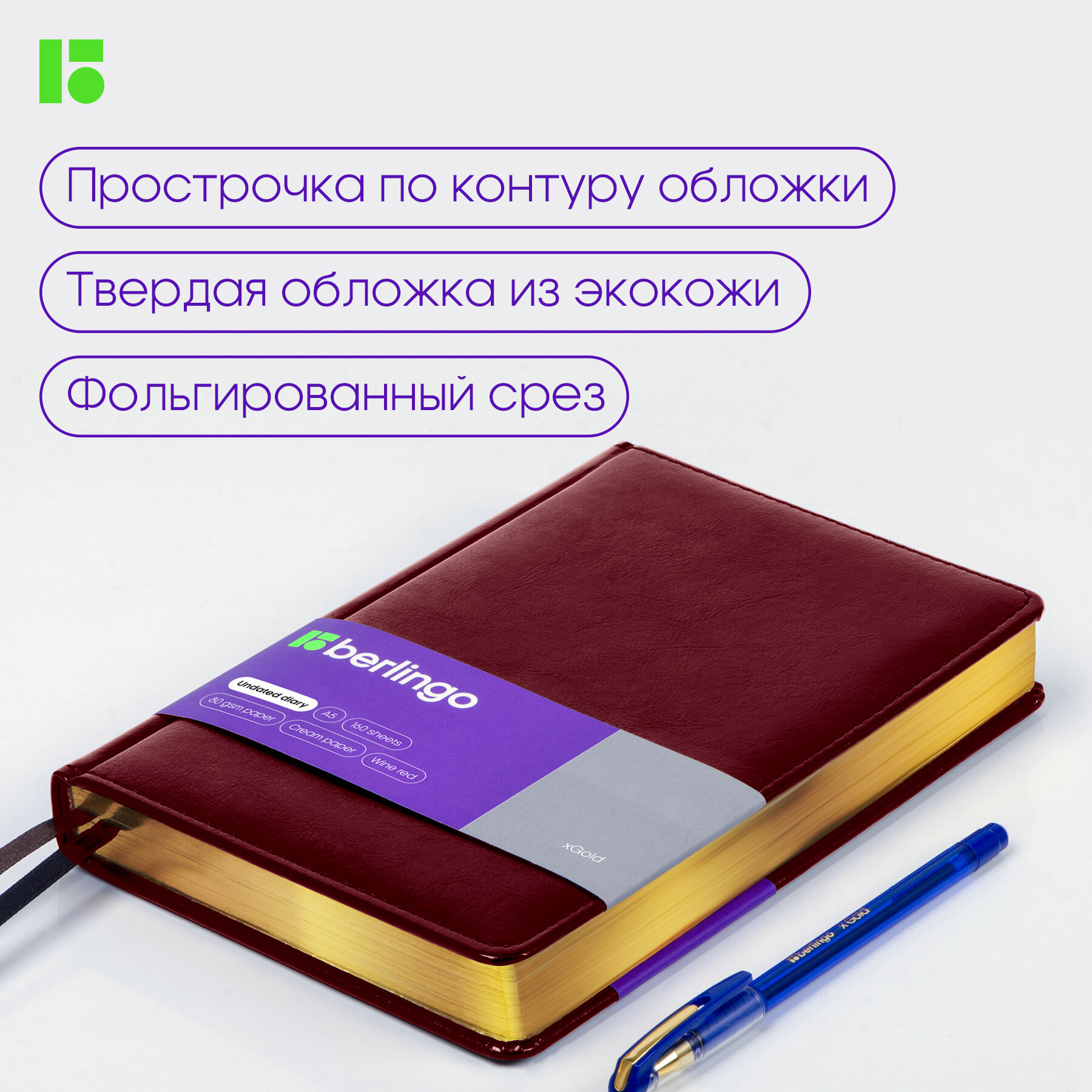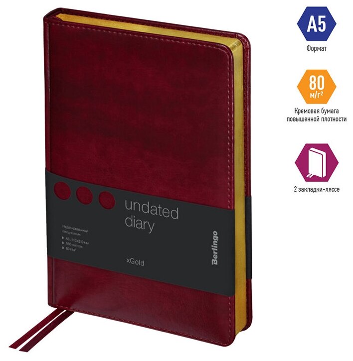 Ежедневник недатированный Berlingo A5, 160 листов, кожзам, "xGold", золотой срез, бордовый (UD0_81504)