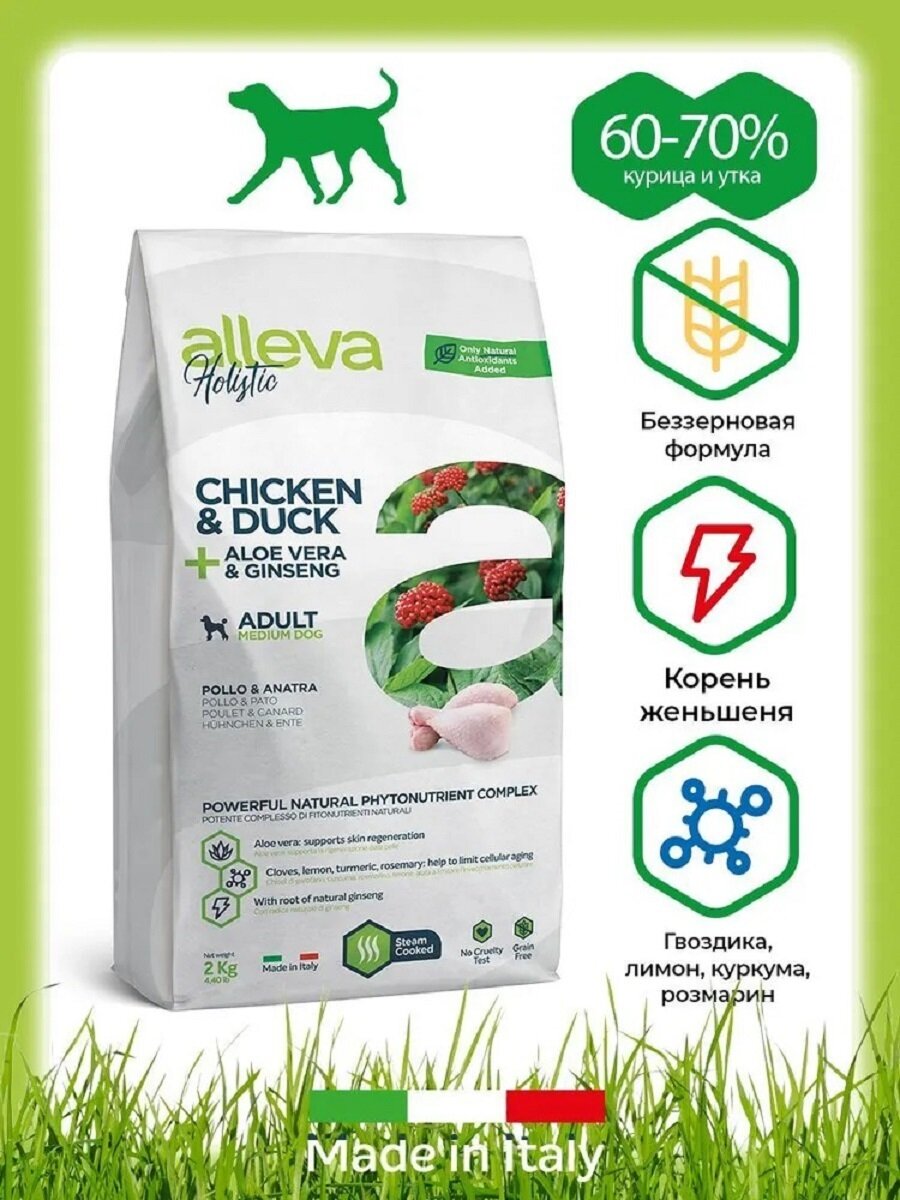 Сухой корм Alleva Holistic MEDIUM для взрослых собак средних пород, с курицей и уткой, алое вера и женьшенем, 2 кг