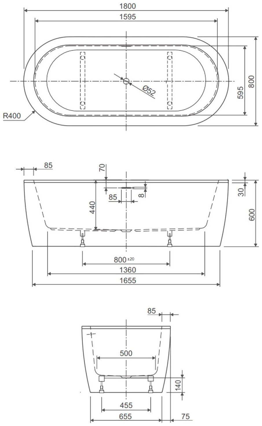 Акриловая ванна отдельно стоящая белая фронтальная панель CEZARES SLIM CENTRAL-180-80-60-W37-SET