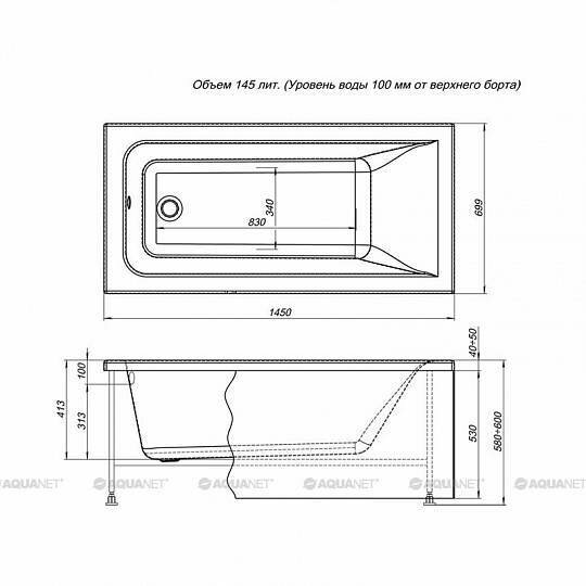 Ванна акриловая AQUANET Bright 239668 145см х 70см, с каркасом