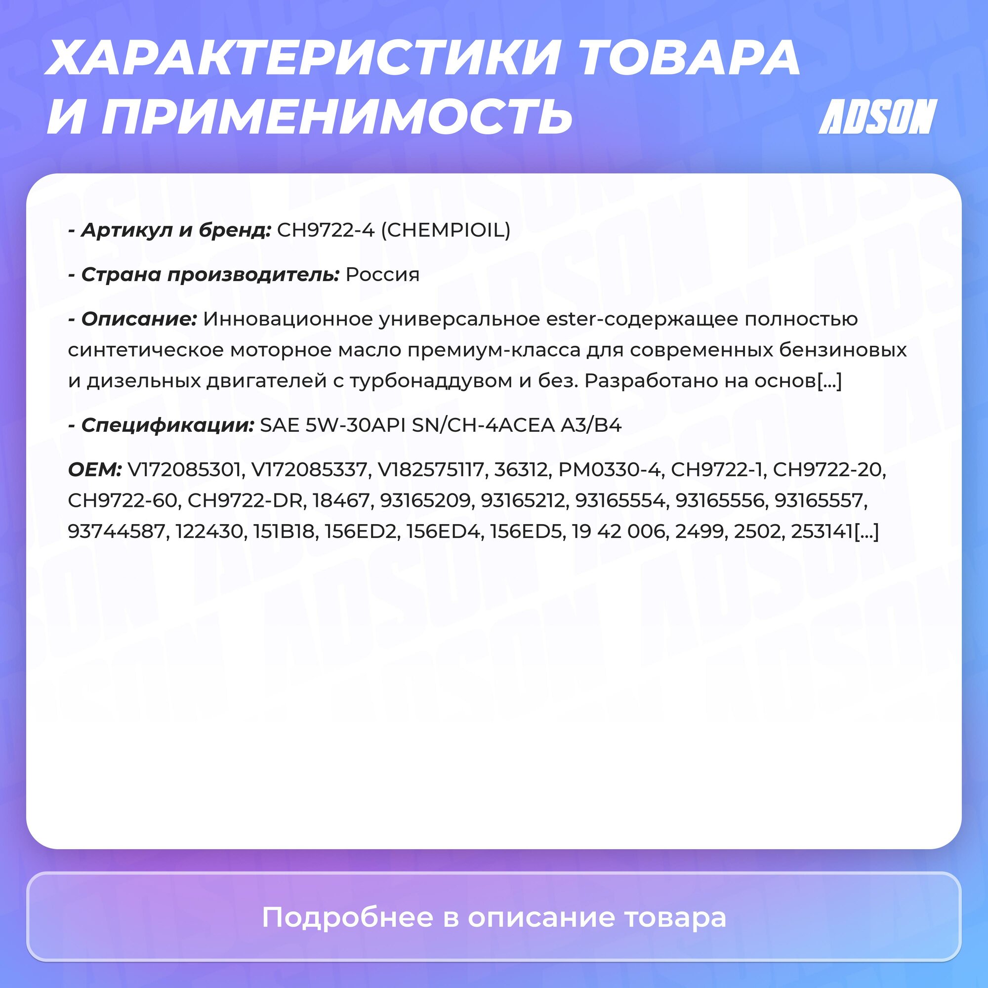 CHEMPIOIL CH9722-20 Снят, замена CH9722-20-E 5W-30 Ultra SL SN/ CH-4, A3/ B4 20л (синт. мотор. масло)