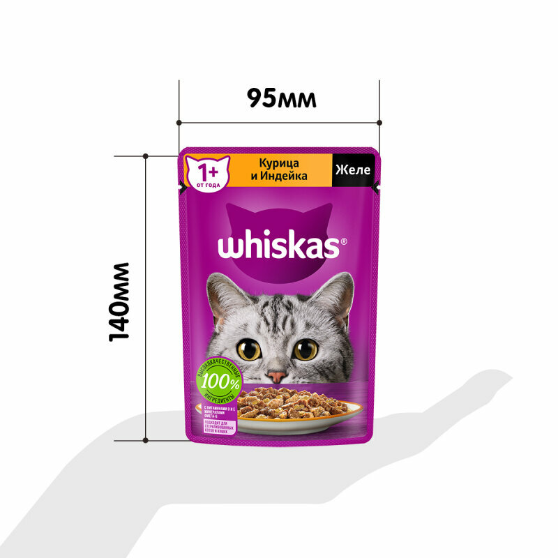 Купить Корм влажный WHISKAS полнорационный для взрослых кошек, желе с курицей и индейкой, 28шт х 75г