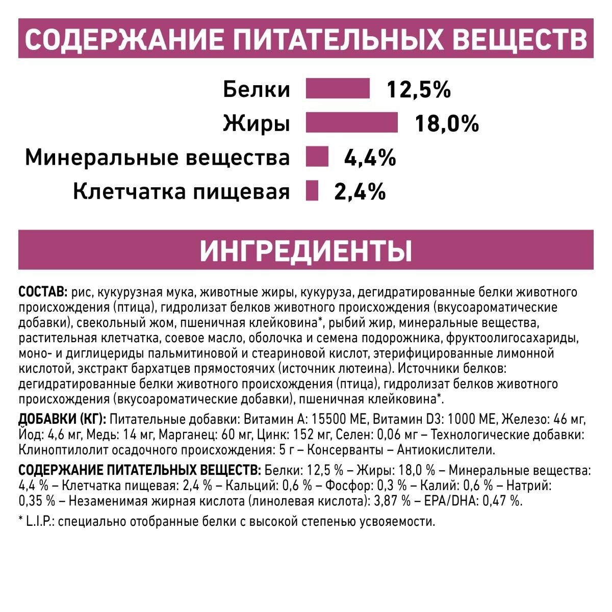 | Состав | рис, кукурузная мука, животные жиры, кукуруза, дегидратированные белки животного происхождения (птица), гидролизат белков животного происхождения (вкусоароматические добавки), свекольный жом, пшеничная клейковина, рыбий жир, минеральные вещества, растительная клетчатка, соевое масло, оболочка и семена подорожника, фруктоолигосахариды, моно- и диглицериды пальмитиновой и стеариновой кислот, этерифицированные лимонной кислотой, экстракт бархатцев прямостоячих (источник лютеина) |
