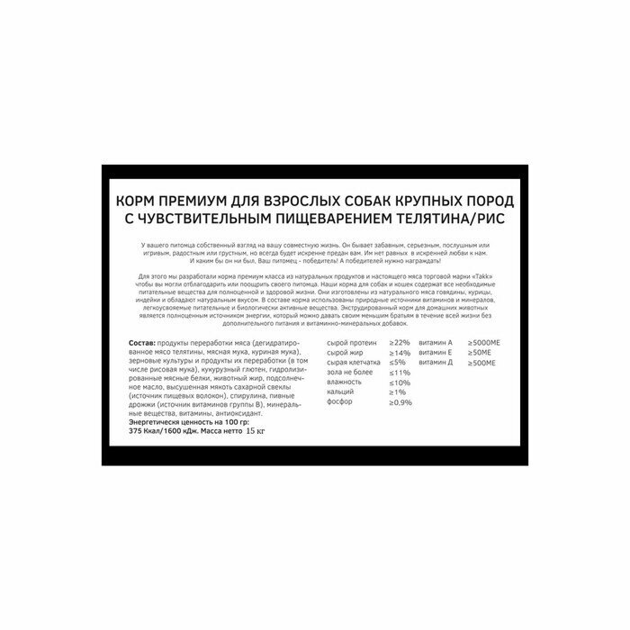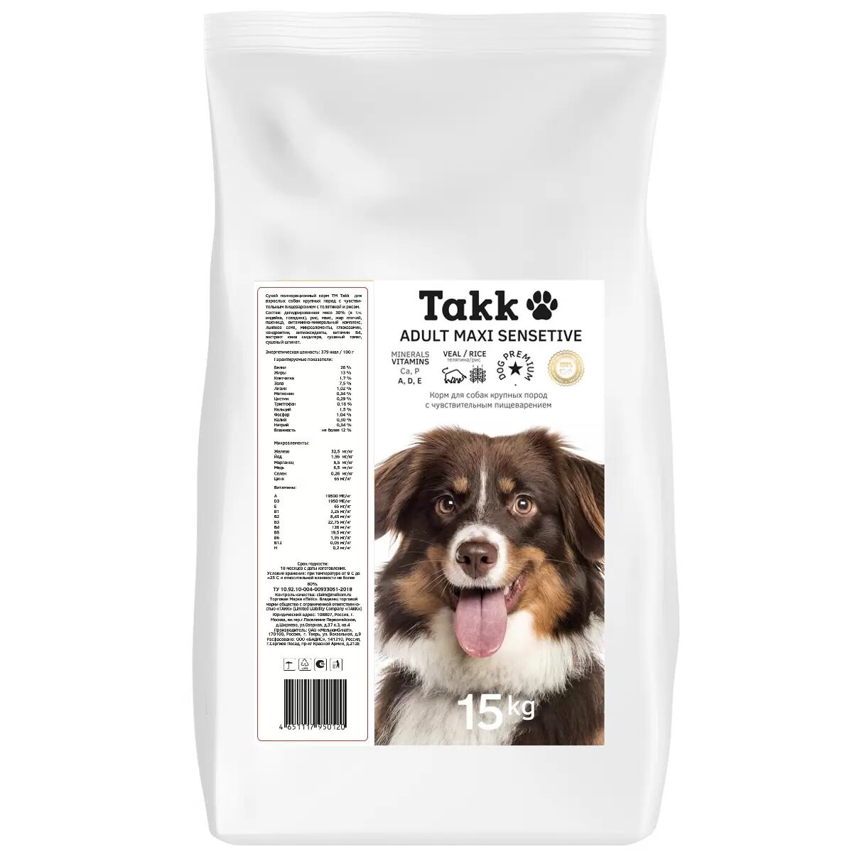 Сухой полнорационный корм ТМ Takk для взрослых собак крупных пород с чувствительным пищеварением с телятиной и рисом, 15 кг
