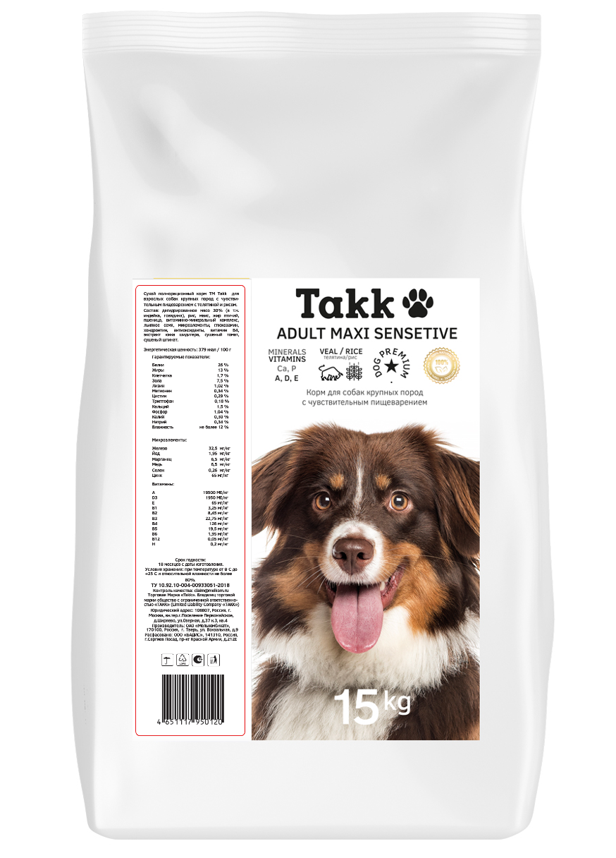 TAKK DOG ADULT MAXI SENSITIVE VEAL & RICE для взрослых собак крупных пород с чувствительным пищеварением с телятиной и рисом (15 кг)